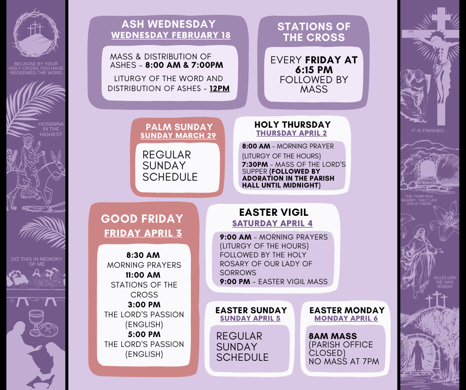 May this Holy Week be for each of us a time of renewal, deeper faith, and a renewed encounter with the love and mercy of Christ. We encourage you to come and celebrate these beautiful liturgies with your family and loved ones.